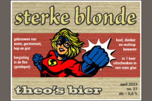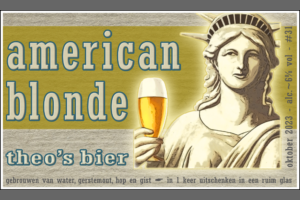Vooruit maar. Om modern te zijn heb ik voor het etiket een kunstmatig-intelligente afbeelding laten genereren met de trefwoorden “het Vrijheidsbeeld met blond haar en een glas bier in de hand”. Dat is even oefenen; de tweede afbeelding was naar mijn zin.