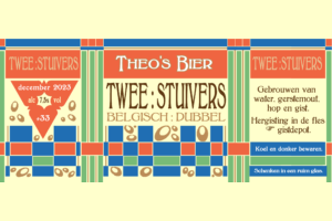 Het etiket is niet snel af. Iets met een monnik? Hm, ik heb toch ook geen klooster. Nog even verder denken en dan kom ik door allerlei toeval hier op uit, een variant op een etiket van een drankenhandel (de firma Oud) uit mijn woonplaats, ongeveer een eeuw geleden ontworpen door Jac. Jongert. Oorspronkelijk gemaakt voor limonadesiroop, maar het werkt ook voor Twee Stuivers Belgisch Dubbel.